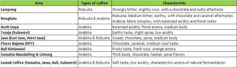 Indonesian coffee is known as one of the best coffees in the world because it has a distinctive taste, variety and high quality. Indonesia is one of the largest coffee producers in the world with various types of superior coffee such as Gayo Coffee (Aceh), Toraja Coffee (Sulawesi), Java Coffee (Java), Flores Coffee (NTT), Bali Kintamani Coffee, and Luwak Coffee.